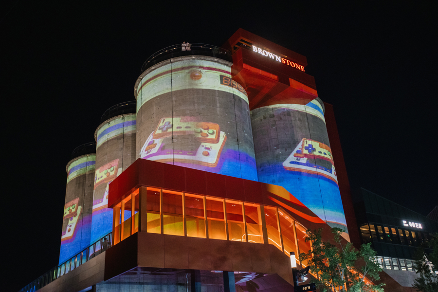 闻名前去观影的居委干部陈纯,在黄浦江边的工业砼仓收获了些意外惊喜:承载着《快乐时间囊》光影秀的砼仓被打造成连接几代人记忆的“快乐地标”——红白机“宇宙巡航机”唤醒80后的童年,像素风“扫雷”勾起90后的青春,电子风上海街景则让新老徐汇人都能找到共鸣。如果伸手触摸砼仓下的激光光帘,还可以看到随动作变换形态的光影,仿佛在与光互动。